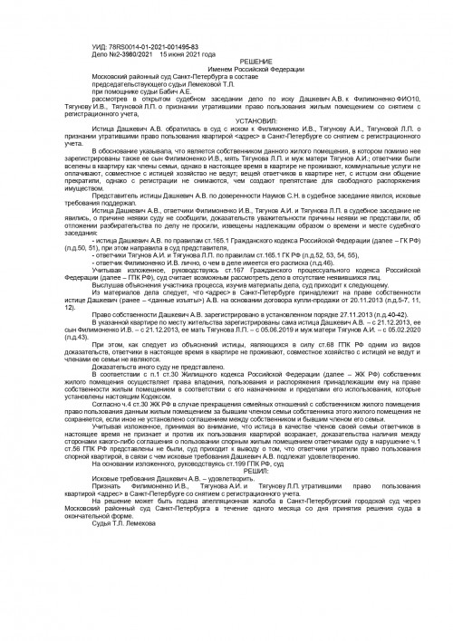 Решение от 15.06.2021г. по гражданскому делу № 2-3980 2021 (о признании утратившими право пользования квартирой)